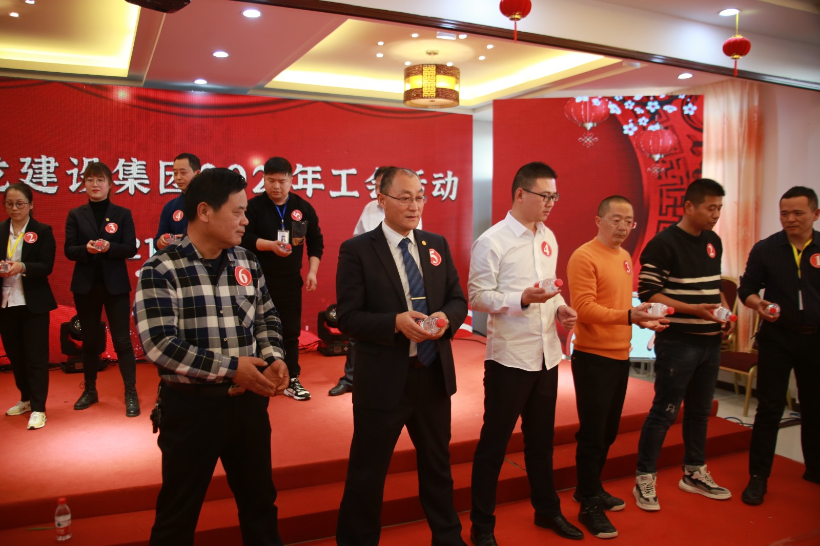 12月31日下午,在一片欢呼声和掌声中,别开生面的年会工会活动在盈康农庄如期而至。第一个游戏是“移形换位”。规则是:“除最后一名选手外,每人手持一瓶矿泉水,待裁判发布开始口令后,矿泉水同时往后传给下一位并接住上一位传来的矿泉水;第一回合后,第一位选手迅速走到队伍最后,重复上述动作;直至第一位选手重新排回队伍最前端为游戏结束,停止计时。游戏过程中,矿泉水每掉落一次,加时2秒”。主持人刚介绍完游戏规则